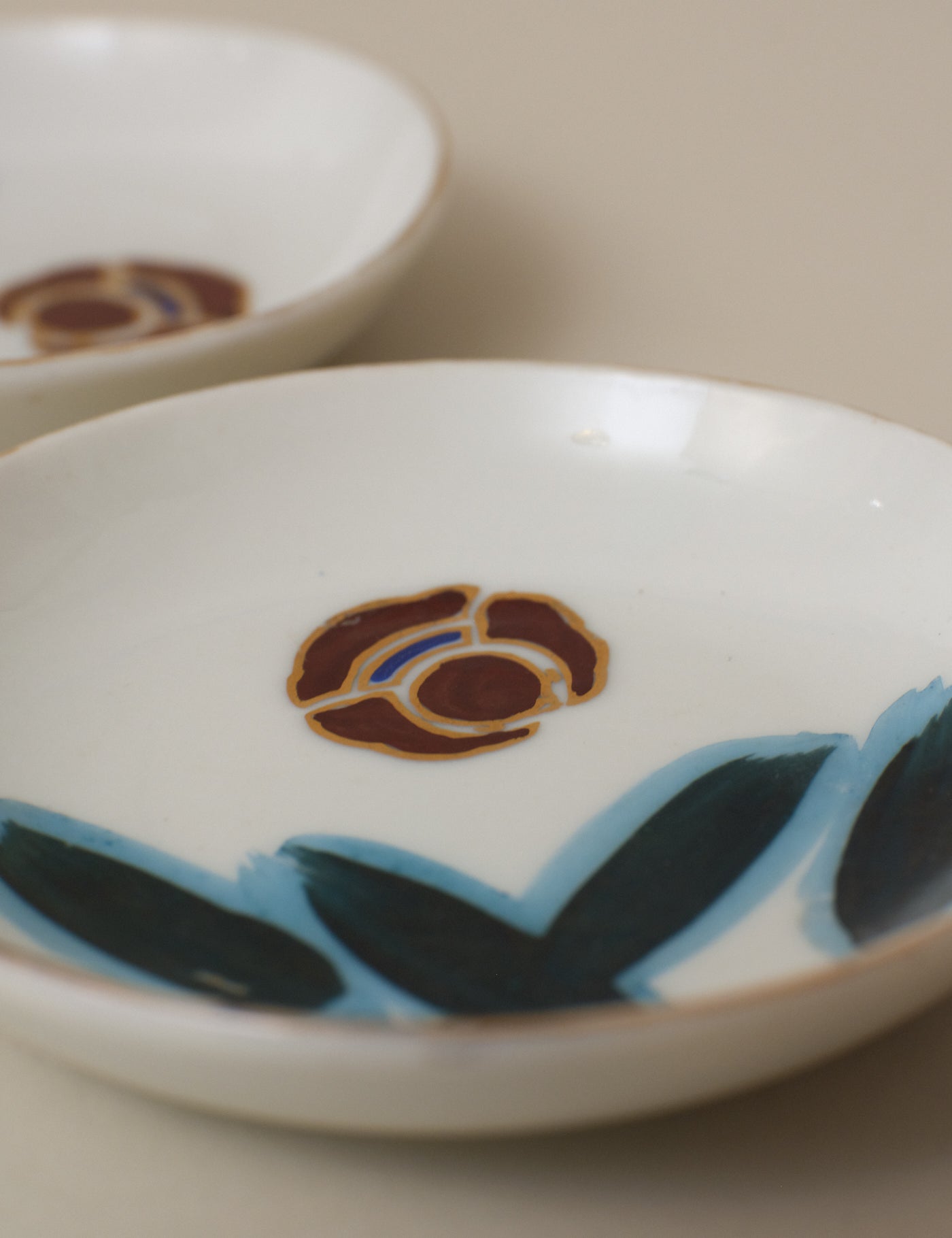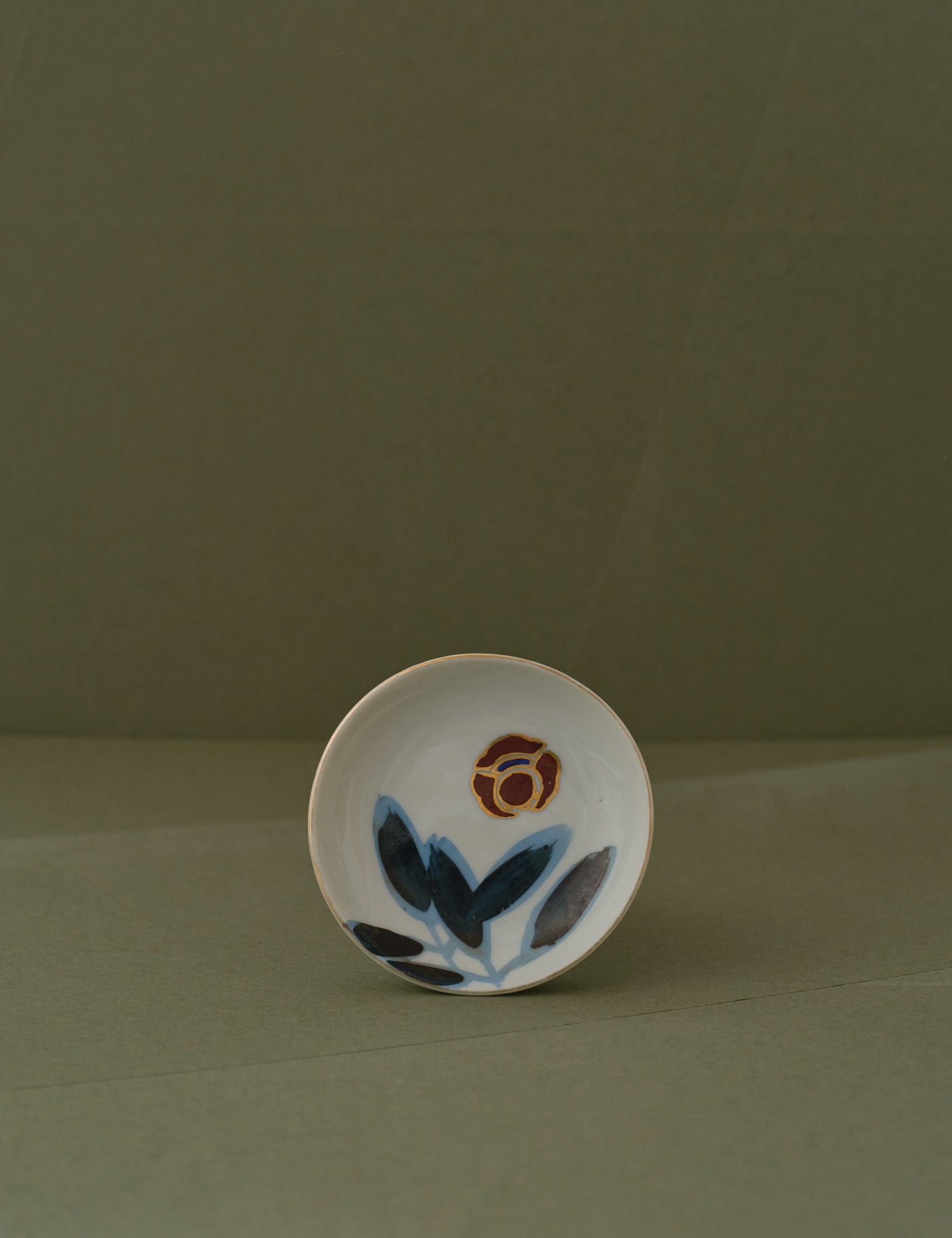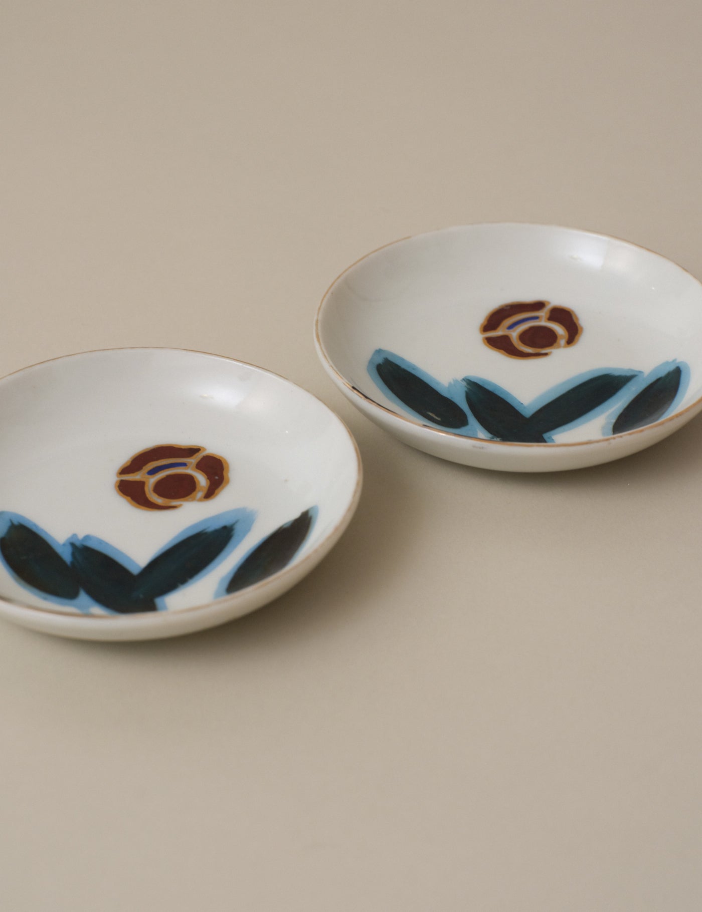 Delicate and compact, this vintage hand-painted plate features floral motifs framed in soft gold — petals painted in red, and leaves shaded in deep blue-green with soft blue outlines. Touches of gold accent the rim, adding a gentle contrast that enhances the refined porcelain surface.