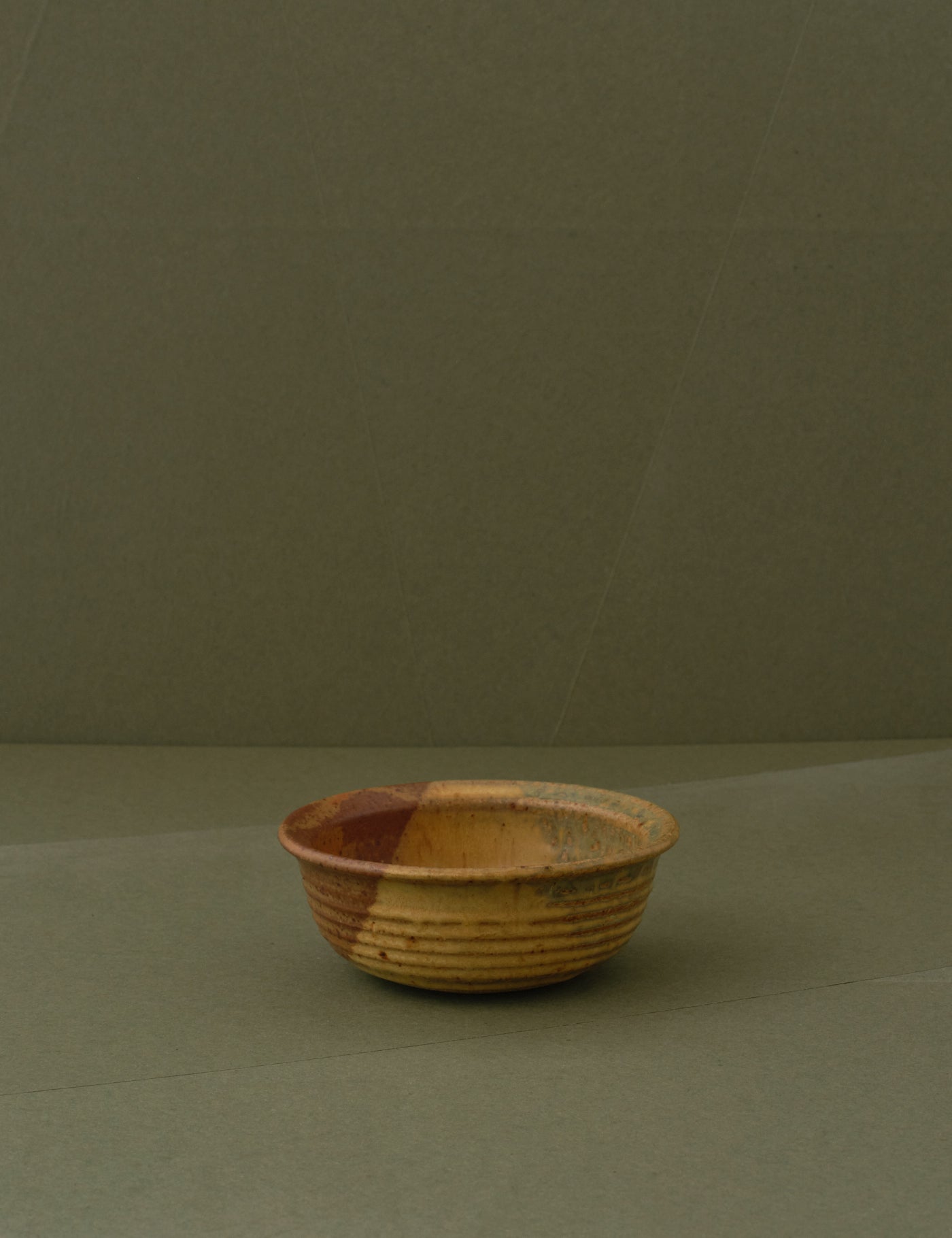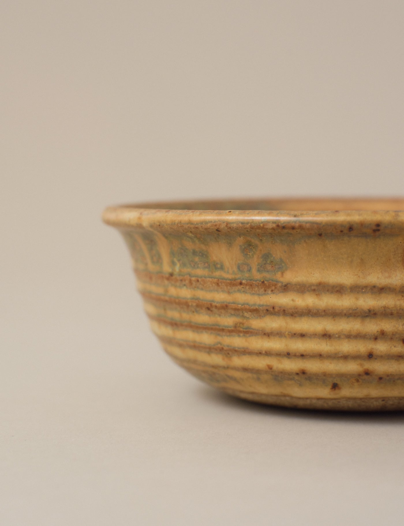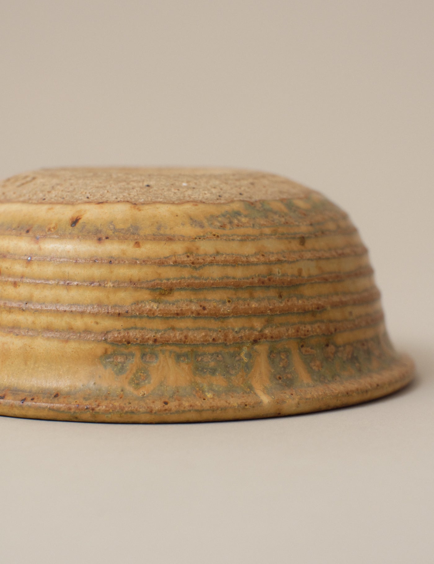 Handcrafted studio pottery bowl by North Carolina ceramic artist Linda Sharpless. Its rounded form and subtly uneven texture highlight the warmth of handmade work. Finished in an earthy glaze that carries a quiet, natural warmth. Artist’s mark “LJS” stamped on the back.