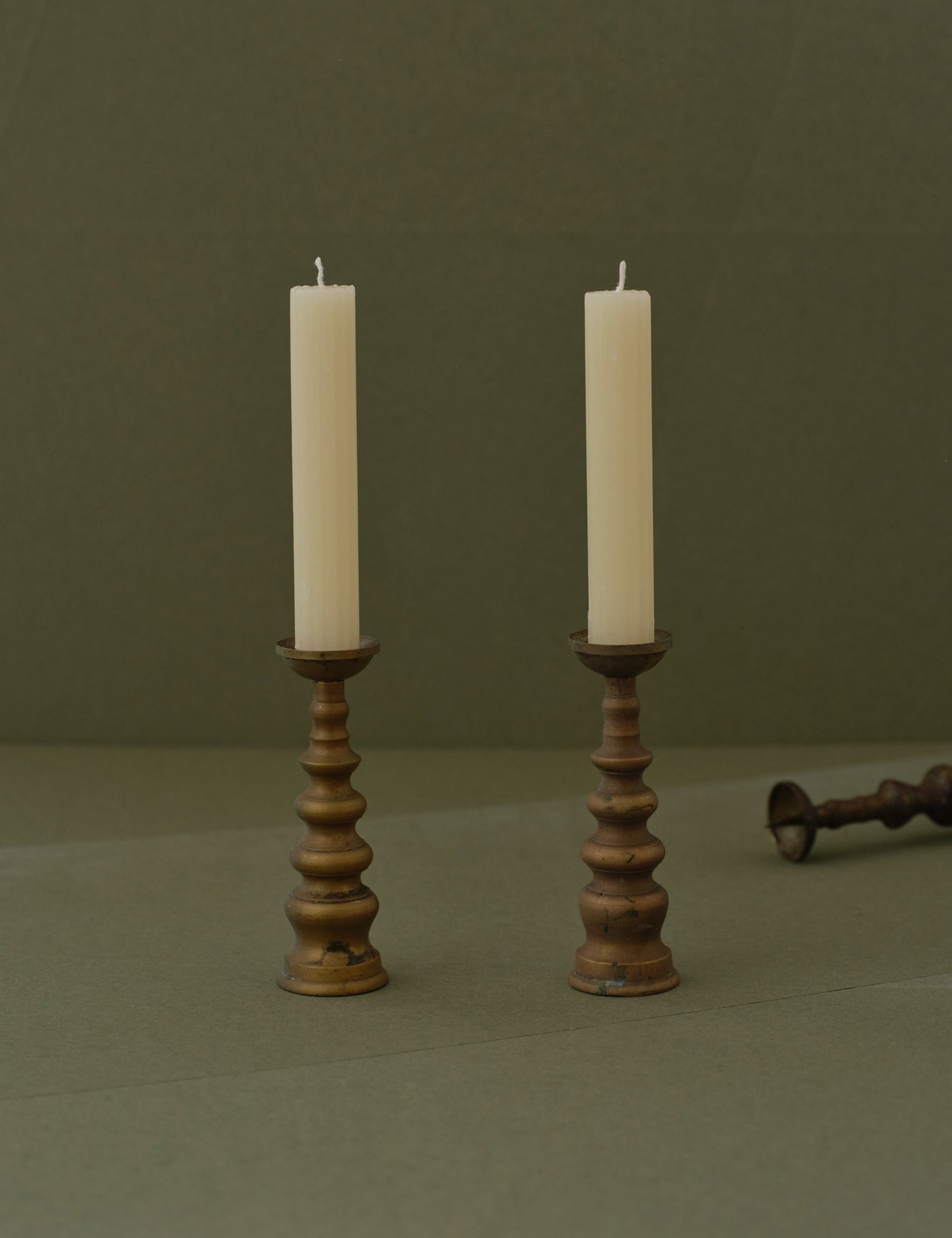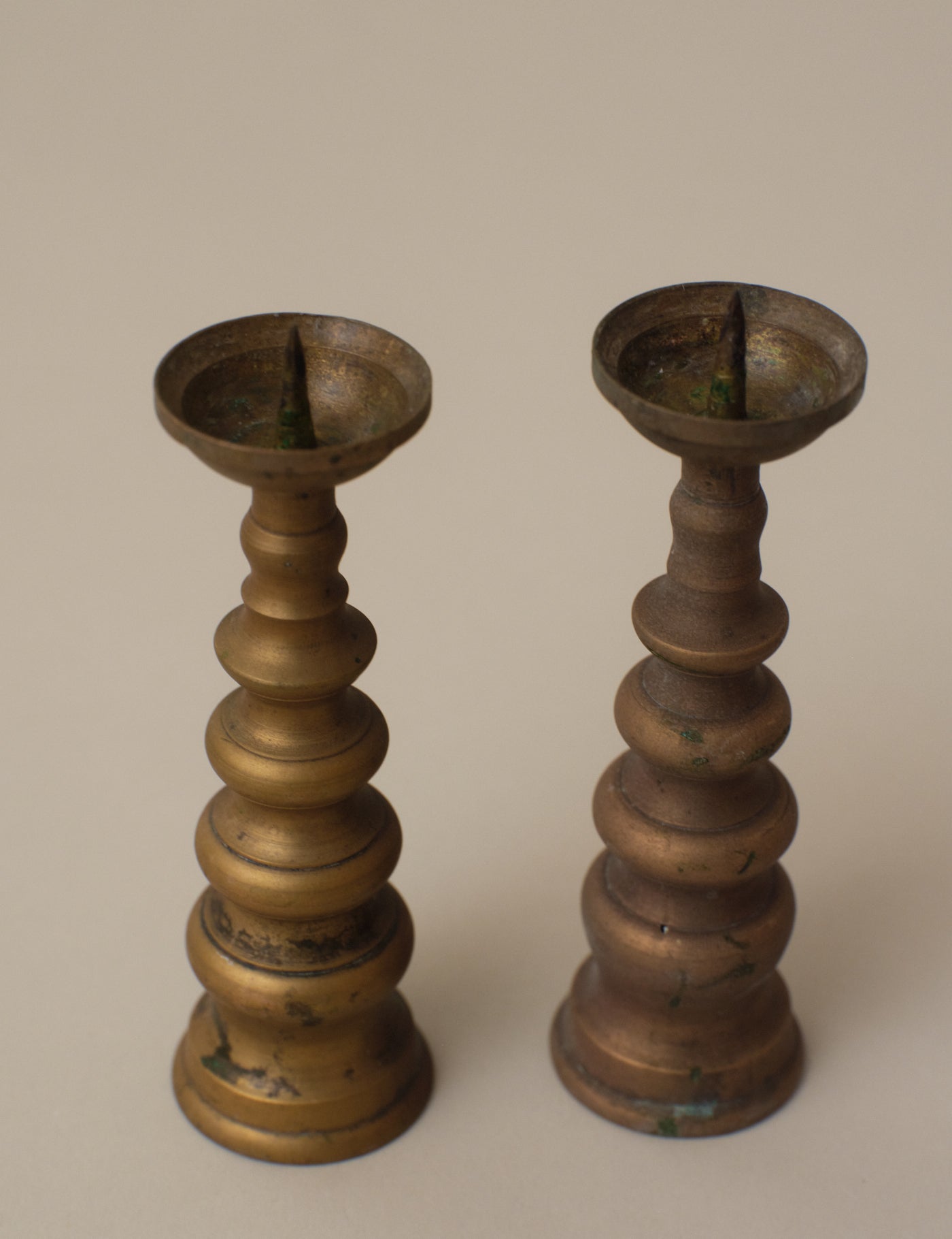 Originally used in a butsudan (Buddhist family altar), these vintage brass candlesticks reveal the quiet beauty shaped by time. With their deep patina and worn surfaces, each piece carries a serene sense of years gone by.